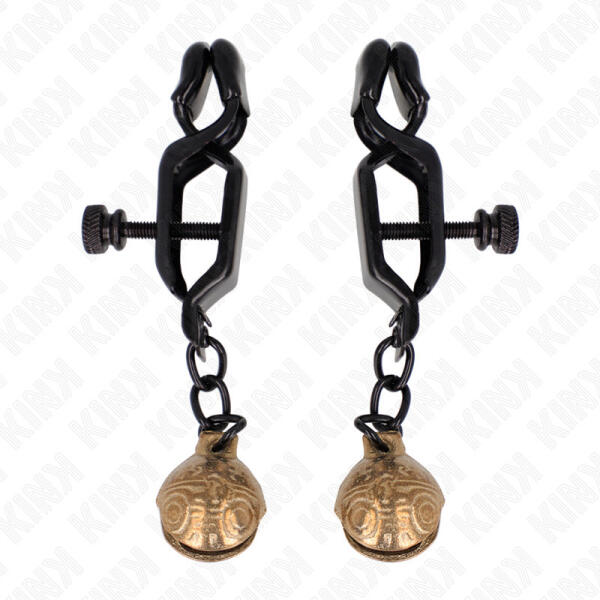 Klasszikus működésű bimbócsíptetők, végeiken összekötő lánccal és csengettyűkkel. A szélesített fejrészű csíptetőrész fémből készült, viszont a bőrrel érintkező végein gumiborítás található. A szorítóhatás alapból megvan, mivel egy rugó nyomja össze a végeket, de egy csavaros rész segítségével csökkenthető, beállítható az. A rajtuk lévő rövid láncon, egy-egy nagyobbacska csengettyű található, ami viselőjének mozdulatait hangjelzéssel jelzi vissza.