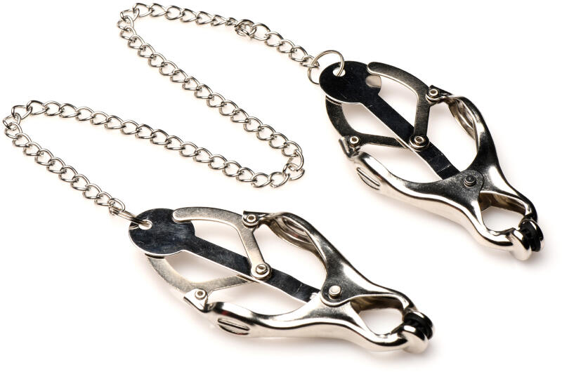 Ezek nem a szokásos mellbimbóbilincsek! A klasszikus, fájdalmas lóherebilincsek után tervezve, ezek még egy csavart is tartalmaznak! Nemcsak a nyomás nő, ha meghúzza a hosszú, 12 hüvelykes láncot…